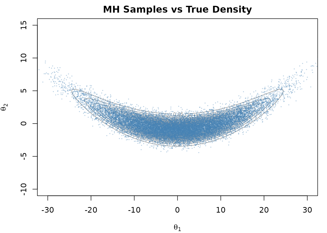 We sample from a “banana-shaped” distribution (Haario, Saksman, and Tamminen 1999). This 2-dimensional distribution consists of two Gaussian densities, where the second is dependent on the first: