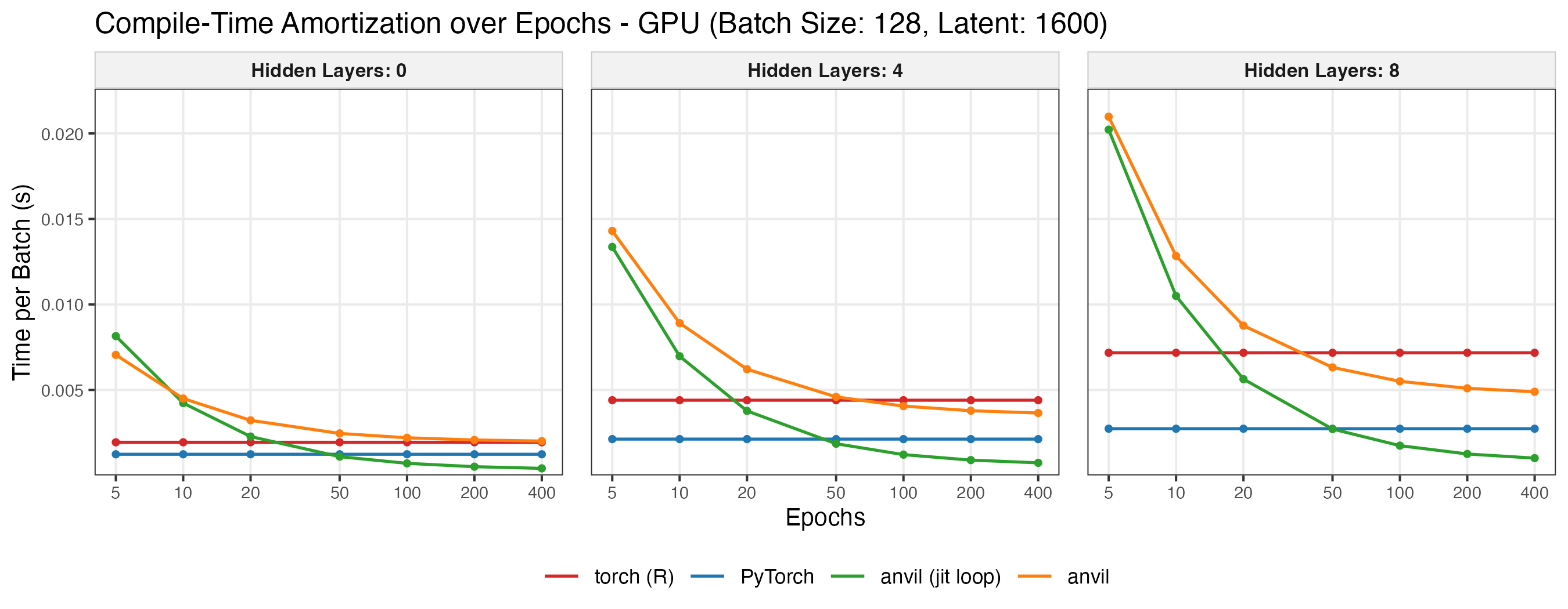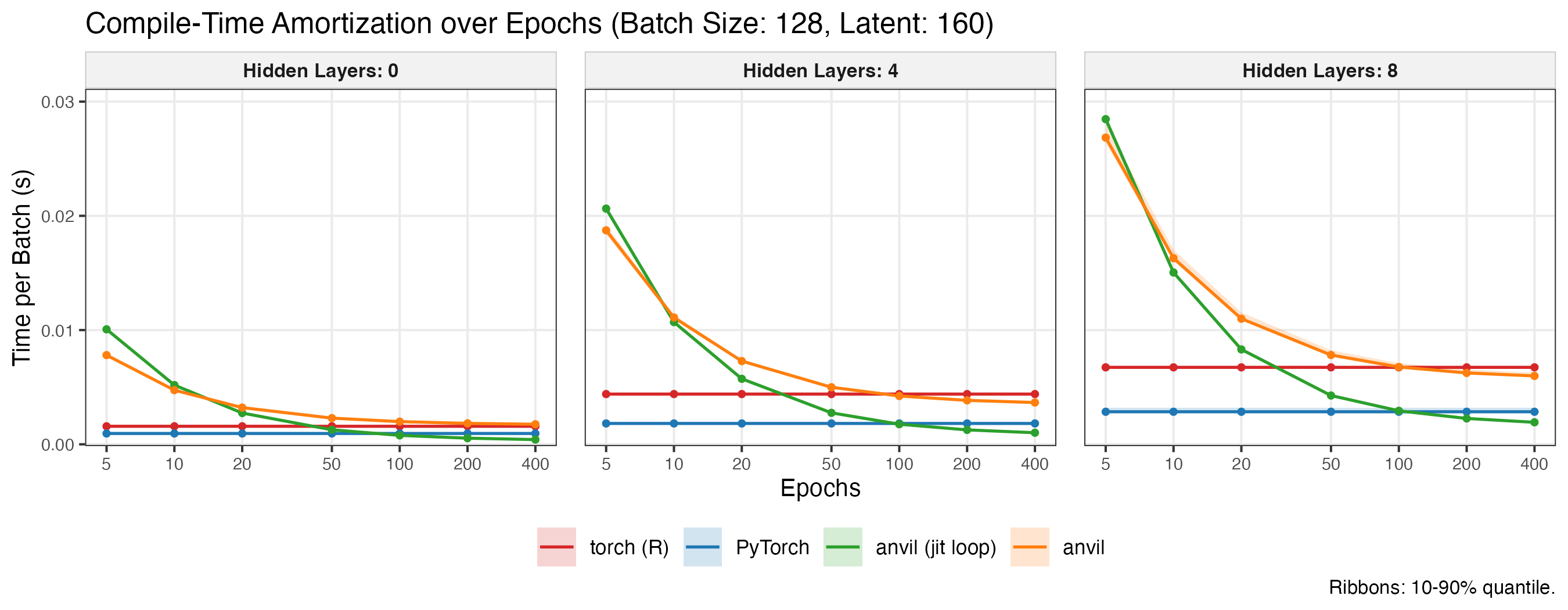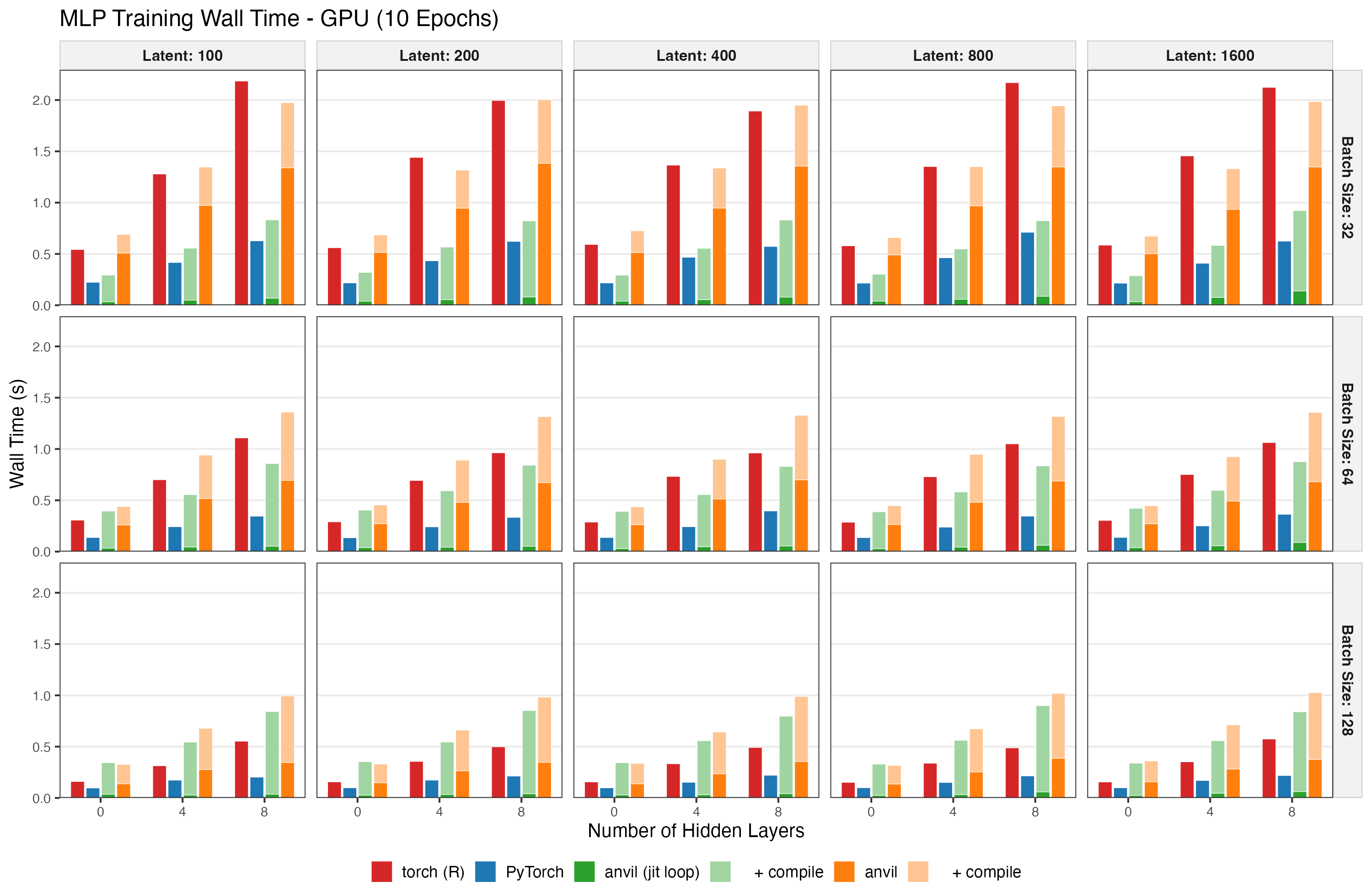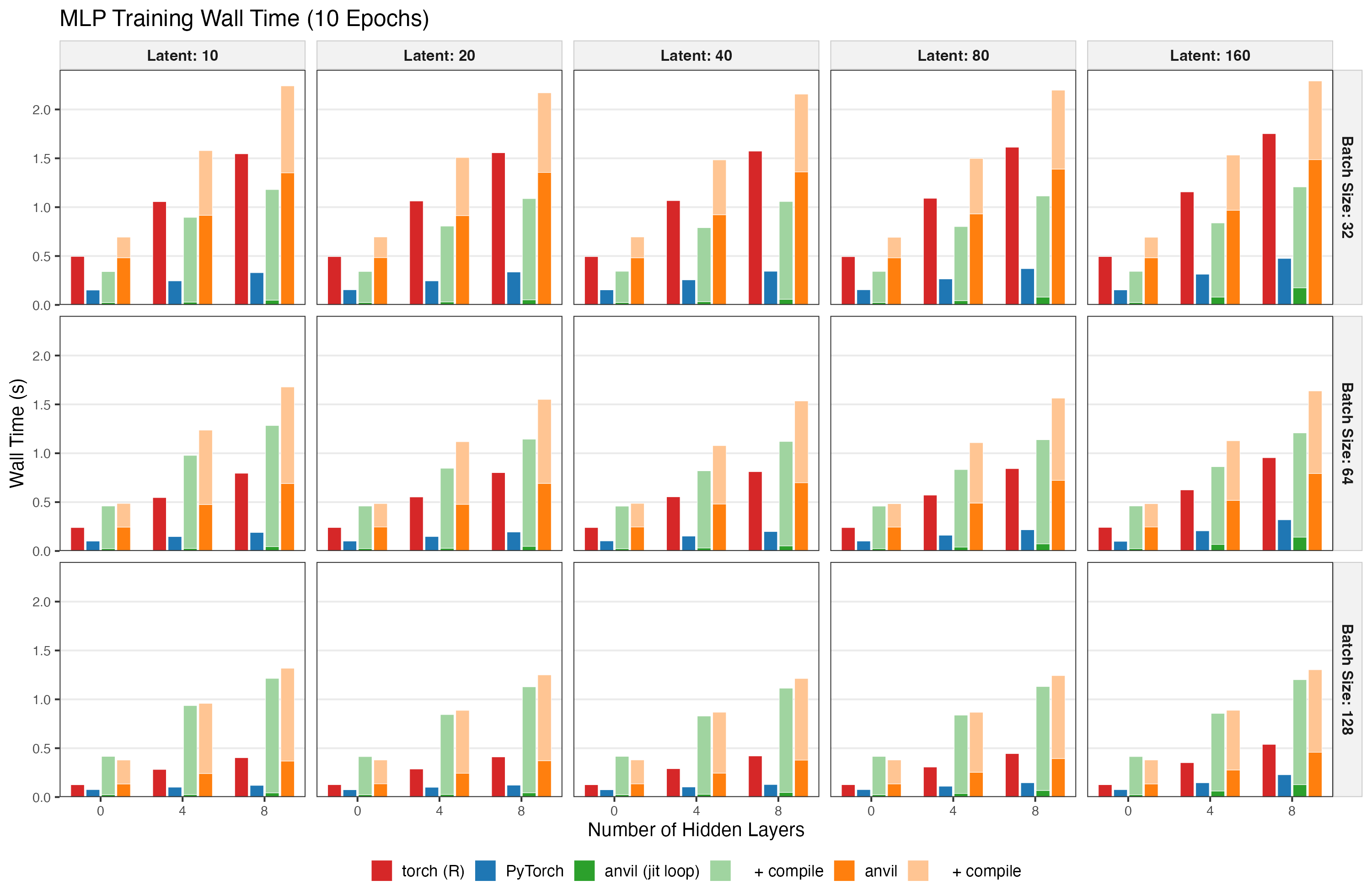 The barplot below shows wall time for 10 epochs of training, decomposed into runtime (solid color) and compilation overhead (lighter shade). Compilation only applies to the anvil variants; for torch and PyTorch it is zero.